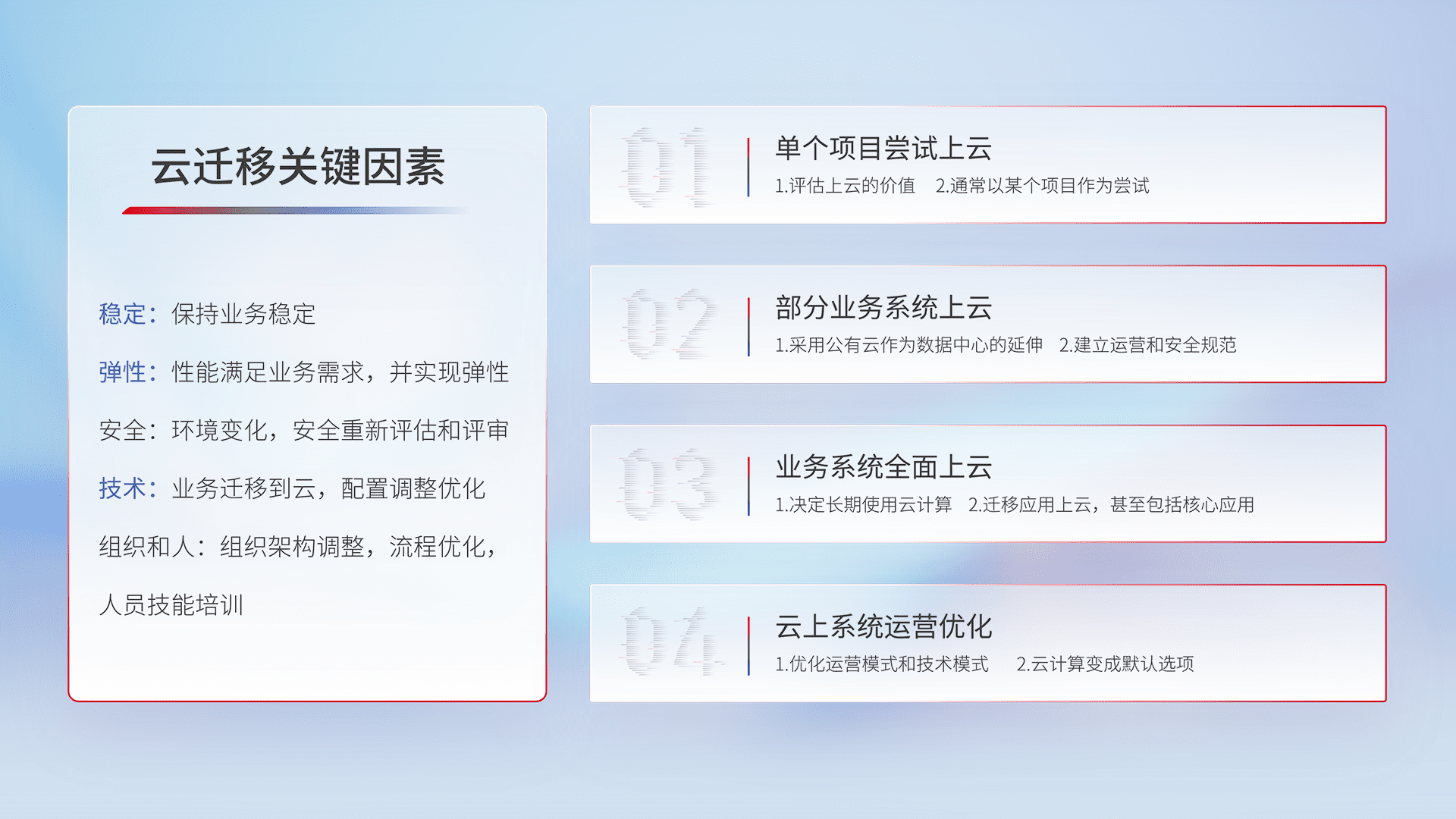 结合实际业务,,,,从规划设计、、云平台选型、、、云原生改造、、、数据迁移、、、、集成交付,,,迁移全过程为客户识别最佳上云路径,,,做好风险识别管理,,设计网络架构、、、身份权限、、、安全审计合规、、、、操作审计、、、日志审计、、监控告警策略、、多站点容灾设计等,,对云上基础设施进行整体规划,,提升IT治理水平,,以满足弹性、、、高可用、、高性能的需求。。。