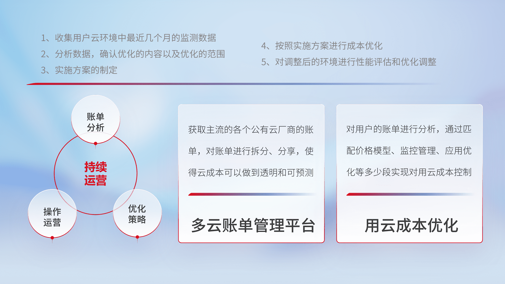 通过多云纳管,,以统一的资源数据模型把客户的云资源进行抽象和封装,,,进而实现对多云资源的统一操作,,,保障云资源管理的可靠性、、、稳定性与可用性。。量身定制化运维内容,,,配置、、开发运维、、、补丁管理、、备份、、、监控、、、认证和访问管理、、、审计和日常巡检等,,,保障在用云过程中的可靠度,,,稳定度以及高可用率。。。